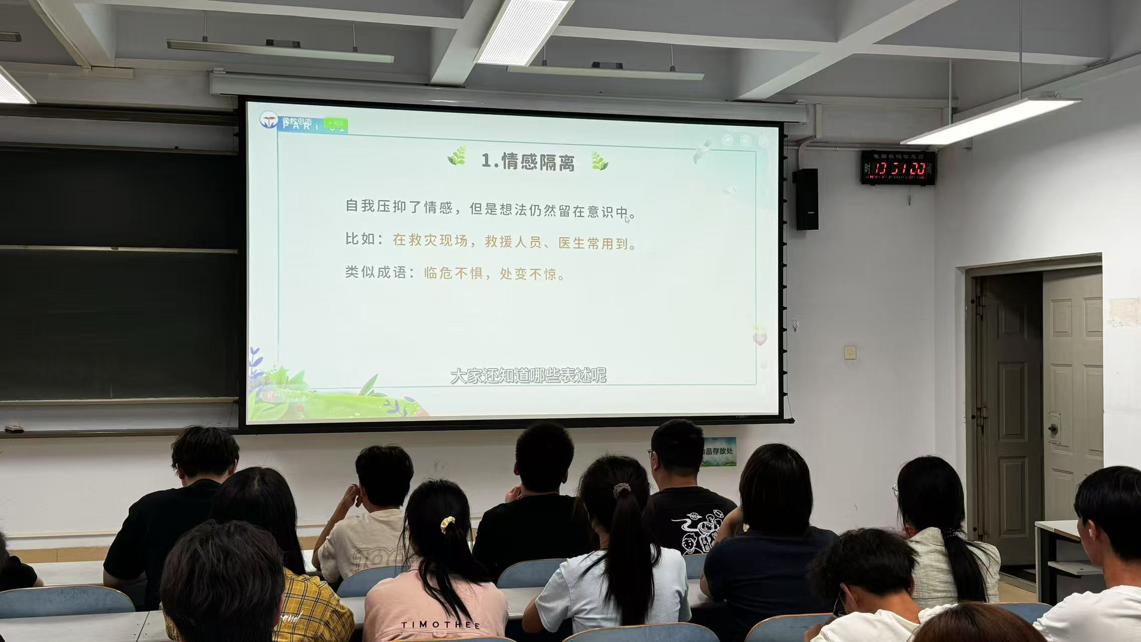 公开课上,信阳师范大学心理健康教育中心咨询师姜金伟老师从较原始的防御机制,到较成熟以及高级防御机制在日常生活中的表现,进行了细致且全面的讲解。通过生动鲜活的日常故事及互动环节,将心理学知识与中华优秀传统文化和大学生的实际生活紧密结合,加深了学生对心理防御机制知识的理解,提高学生的自我认知和情绪行为管理的意识,以便更好地适应大学生活。