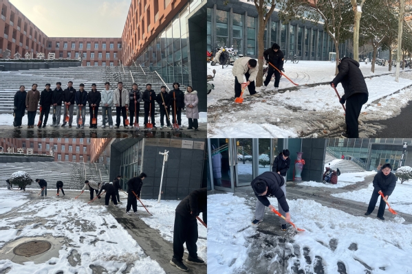 降雪后,校园内的主干道、工程楼门口等区域被厚厚的积雪覆盖,部分路段还形成了薄冰。学院师生进行分组、分工协作,有的弯腰清扫路面浮雪,有的奋力铲除顽固薄冰,铁器与冰层碰撞发出清脆的“哐哐”声,碎冰四溅,大家干劲十足、热情高涨,不畏严寒、不惧劳累,现场一片热火朝天的劳动景象。